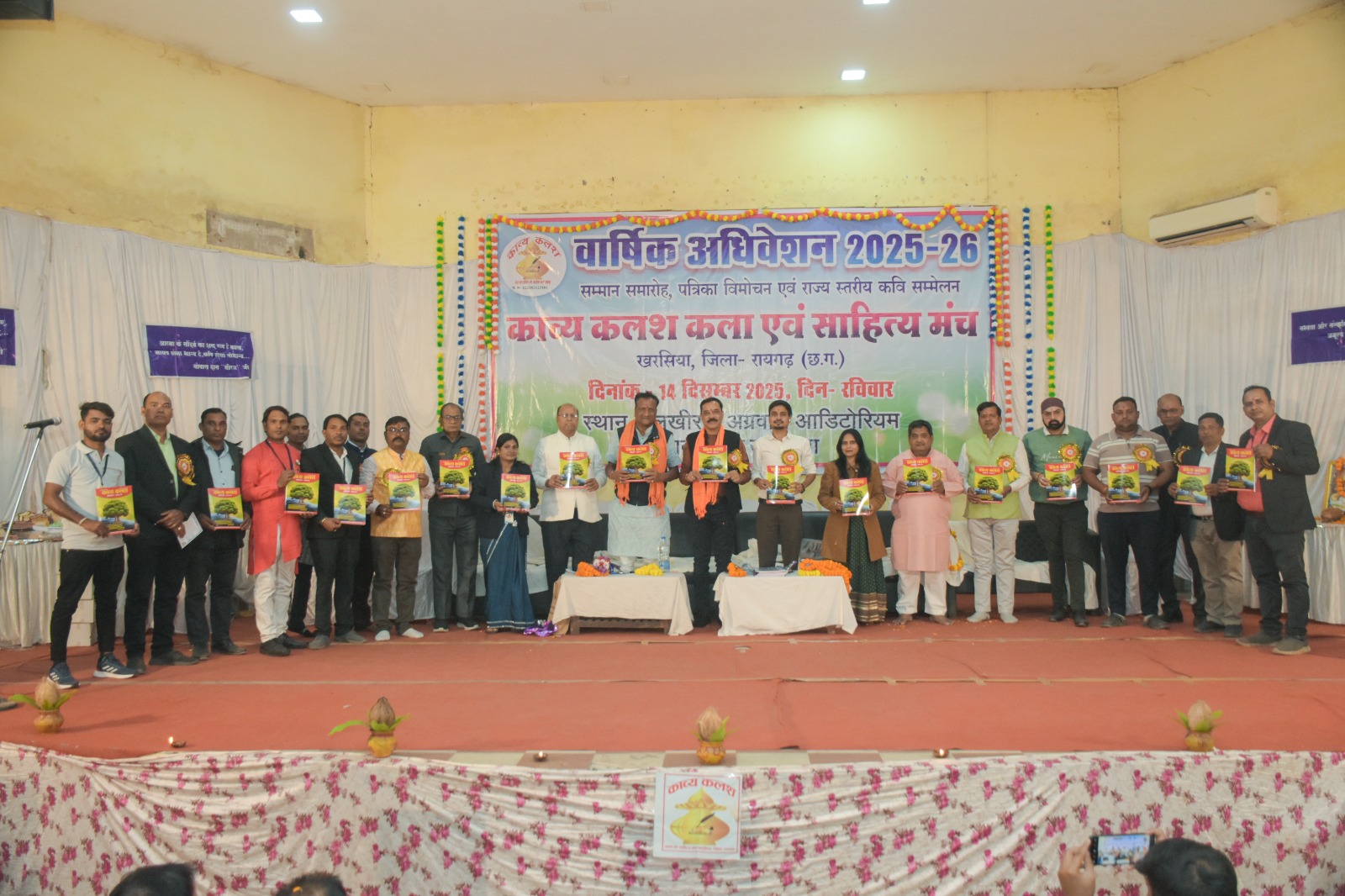 खरसिया | काव्य कलश कला एवं साहित्य मंच, खरसिया (जिला रायगढ़) द्वारा आयोजित पंचम वार्षिक अधिवेशन, सम्मान समारोह एवं अखिल भारतीय कवि सम्मेलन 14 दिसंबर रविवार को लखीराम अग्रवाल ऑडिटोरियम, ठाकुरदिया खरसिया में हर्षोल्लास के साथ सम्पन्न हुआ। प्रातः 10 बजे से शाम 6 बजे तक चले इस विशाल साहित्यिक महोत्सव में प्रदेशभर से आए साहित्यकारों, कवियों एवं साहित्यप्रेमियों ने उत्साहपूर्वक भाग लिया।कार्यक्रम में मुख्य अतिथि के रूप में नगर पालिका परिषद खरसिया के अध्यक्ष कमल गर्ग उपस्थित रहे। विशिष्ट अतिथि के रूप में मान. अवधनारायण सोनी, हेल्पिंग हैंड्स फाउंडेशन के प्रदेश अध्यक्ष अंकित अग्रवाल, प्रदेश उपाध्यक्ष विन्नी सलुजा,वरिष्ठ साहित्यकार रमेश सिंघानिया, राजभाषा आयोग रायपुर के समन्वयक रामेश्वर शर्मा, तथा गौसेवक राकेश केशरवानी समेत अनेक गणमान्य अतिथि उपस्थित रहे।