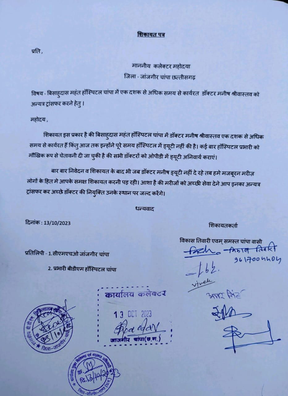 शिकायतकर्ताओं ने मांग की थी कि डॉ. मनीष श्रीवास्तव को चांपा से हटाया जाए, ताकि अस्पताल का संचालन नियमों और प्रक्रियाओं के अनुरूप हो सके।