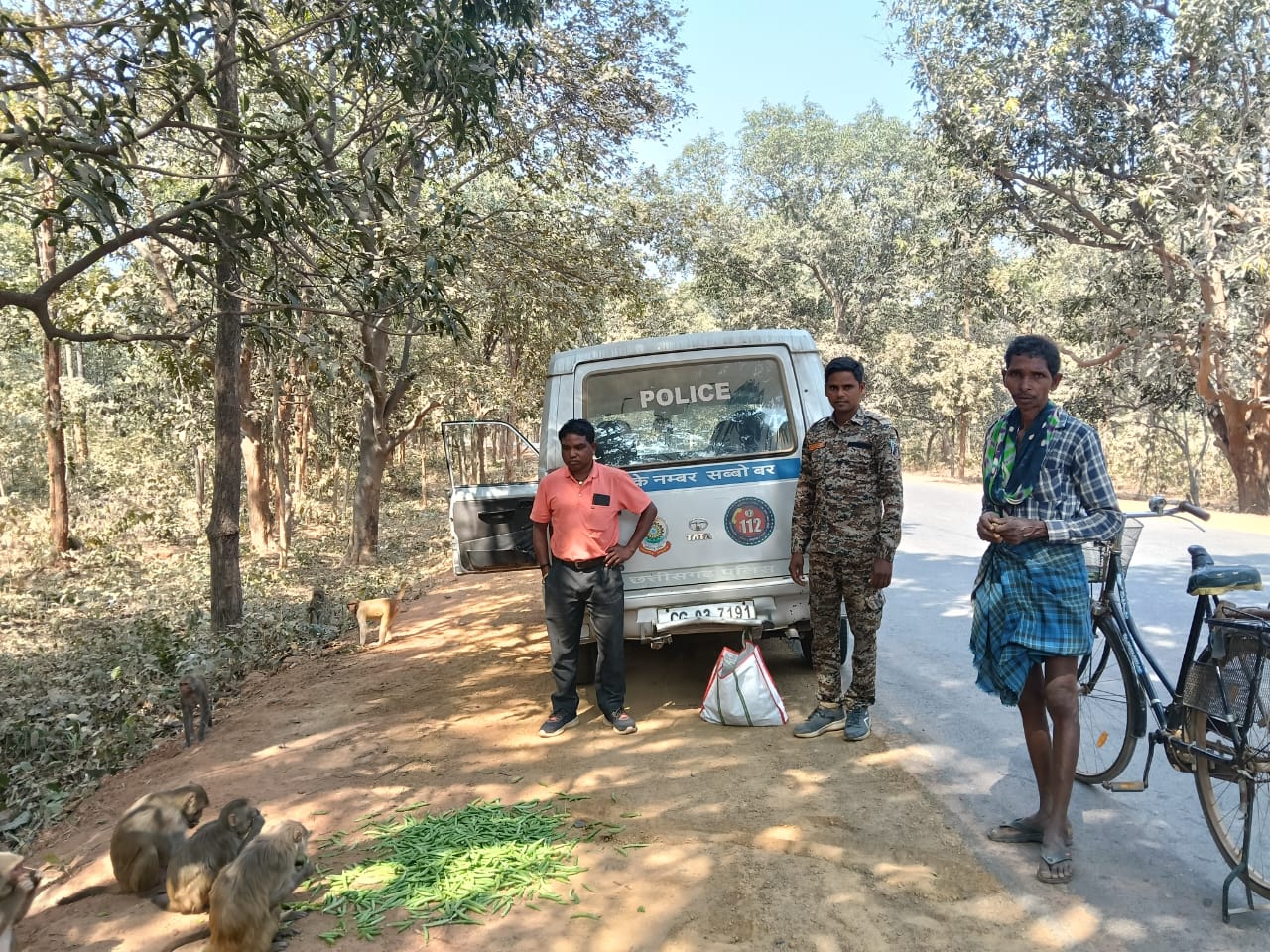 छाल थाने की पुलिस टीम रोजाना की भांति आज डायल 112 की गाड़ी में पेट्रोलिंग में निकली थी इस दौरान उन्होंने छाल – धरमजयगढ़ मुख्य मार्ग पर सड़क किनारे बंदरों के झुंड को देखकर पुलिस जवानों ने न सिर्फ बंदरों को बाजार से मटर खरीदकर खिलाया, बल्कि उन्हें प्यार से पानी भी पिलाया। इस संवेदनशील पहल से राहगीरों और आम नागरिकों में खुशी की लहर दौड़ गई।