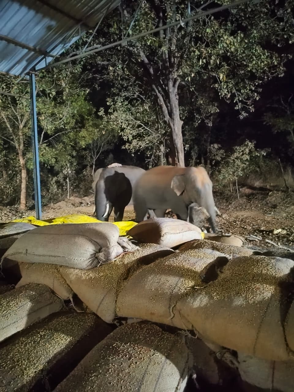 रायगढ़. जिले में बीती रात धान खरीदी केन्द्र पहुंचकर तीन जंगली हाथियों ने तकरीबन 10 से अधिक धान की बोरियों को खाकर और फैलाकर नुकसान पहुंचाया है। मामले की जानकारी मिलते ही वन विभाग की टीम नुकसान का आंकलन करते हुए आगे की कार्रवाई में जुट गई है। मामला रायगढ़ वन मंडल का है।