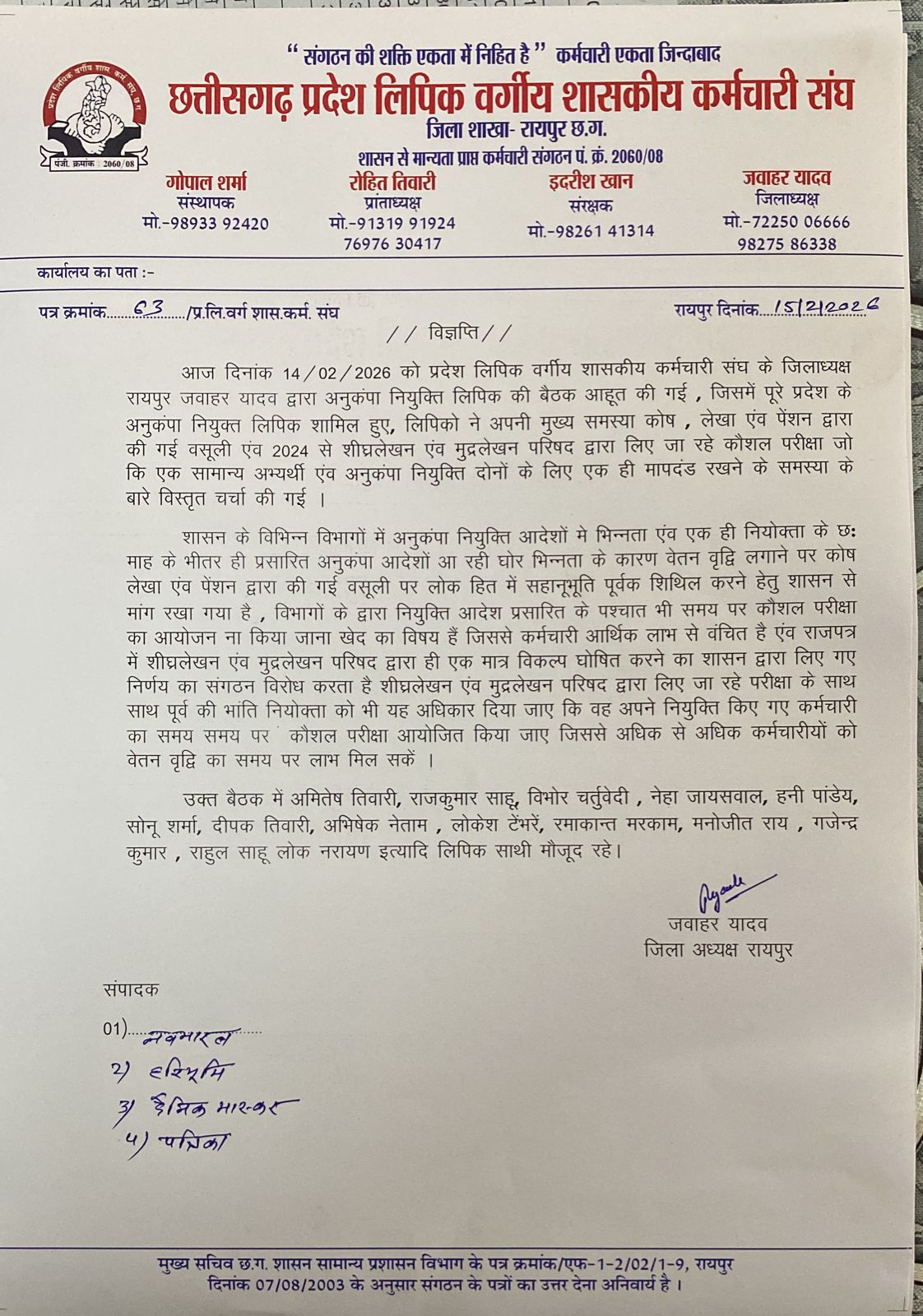 उक्त बैठक में अमितेष तिवारी, राजकुमार साहू, विभोर चर्तुवेदी, नेहा जायसवाल, हनी पांडेय, सोनू शर्मा, दीपक तिवारी, अभिषेक नेताम, लोकेश टेंभरें, रमाकान्त मरकाम, मनोजीत राय, गजेन्द्र कुमार, राहुल साहू लोक नरायण इत्यादि लिपिक साथी मौजूद रहे।