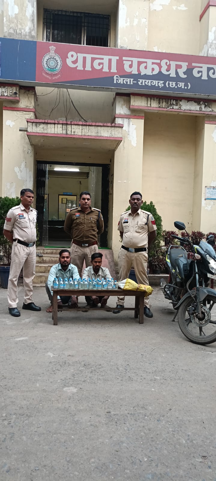 थाना चक्रधरनगर पुलिस ने कल मुखबीर सूचना पर ग्राम जामगांव रेलवे फाटक के पास मोटरसाइकिल क्रमांक CG13 AP 6297 में (1) मुकेश सतनामी S/O गुरूचरण सतनामी उम्र 25 वर्ष साकिन ग्राम महापल्ली PS चक्रधरनगर (2) जितेन्द्र यादव S/O बालक राम यादव उम्र 28 वर्ष निवासी ग्राम महापल्ली थाना चक्रधरनगर को गिरफ्तार कर उनके कब्जे से 50 नग देशी मदिरा (9 लीटर) तथा मोटरसाइकिल जब्त की। दो अन्य कार्रवाई में ग्राम छिरवानी में की गई जिसमें आरोपिया सुशीला बरेठ, 45 साल से 11 लीटर महुआ शराब जप्त कर कार्रवाई किया गया है तथा आरोपी राकेश कुमार राठिया पिता देव सिंह राठिया उम्र 34 वर्ष पता छिरवानी, से 10 लीटर महुआ शराब कीमती 2000/- रूपये जप्त किया गया है । साथ ही 05 व्यक्तियों के विरुद्ध भी धारा 36(च) आबकारी एक्ट के तहत कार्रवाई की गई है।