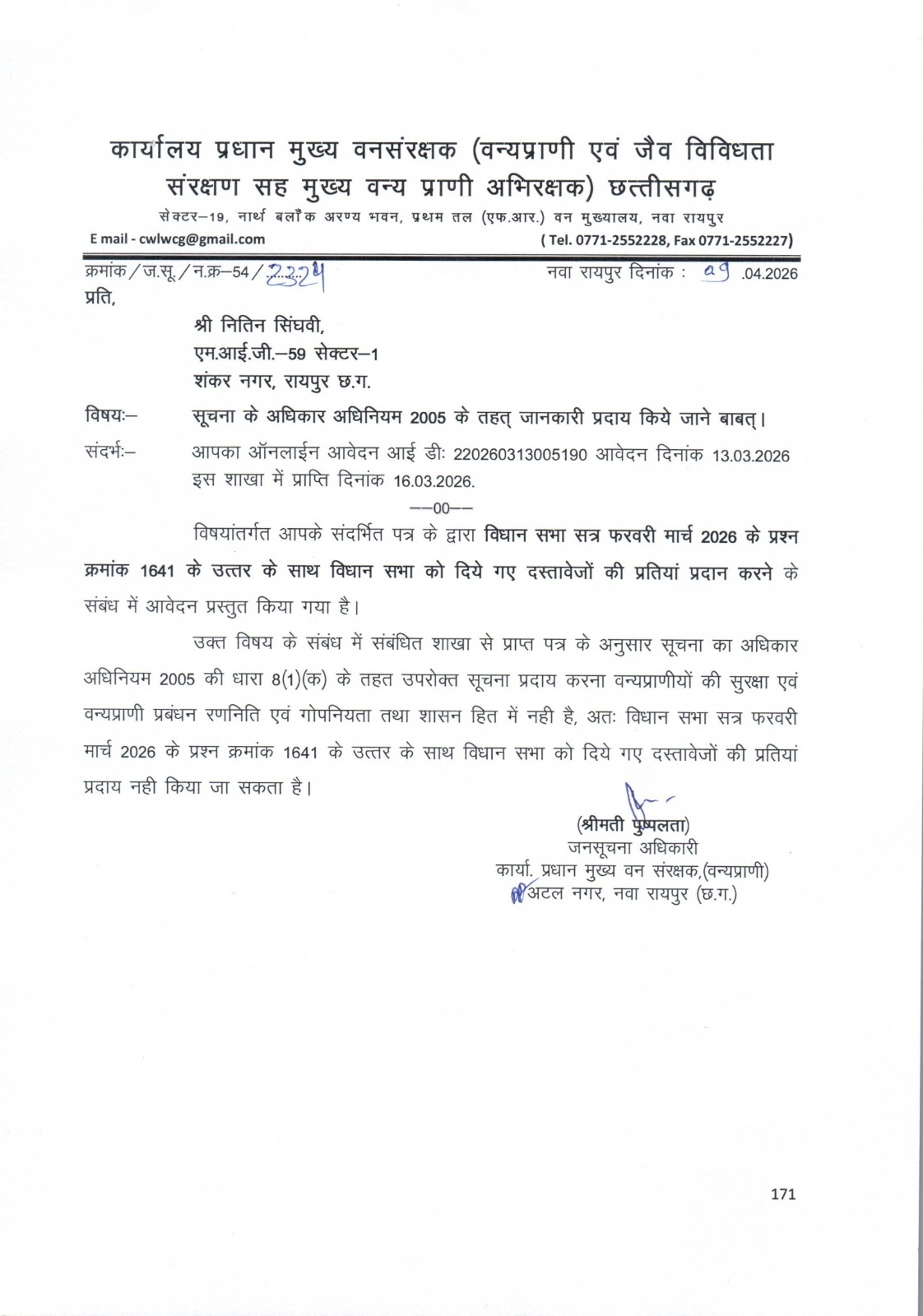 विभाग ने यह भी नहीं बताया कि वन्यजीवों की मौत की जानकारी, जो कि विधानसभा को देकर सार्वजनिक कर दी गई है, एक नागरिक को देने से छत्तीसगढ़ की सुरक्षा, रणनीति, वैज्ञानिक या आर्थिक हित तथा विदेश संबंधों पर कैसे प्रतिकूल प्रभाव पड़ेगा या कैसे अपराध करने को उकसावा या प्रोत्साहन मिलेगा।